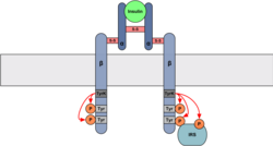 Wenn ein Insulinmolekül von den beiden α-Untereinheiten gebunden wird, kommt es zu einer Konformationsänderung. Die beiden β-Untereinheiten nähern sich einander an und phosphorylieren sich gegenseitig. Daher handelt es sich um eine trans-Autophosphorylierung. Die Kinase-Domänen der β-Untereinheiten erfahren durch die Phosphorylierung eine Konformationsänderung und werden dadurch aktiviert.[2]