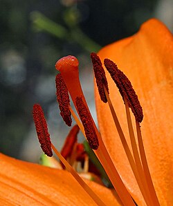 Beispiel für eine Blüte der Einkeimblättrigen mit Perigon, Stempel und Staubblättern (hier Feuer-Lilie) -