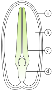 Manche Blütenpflanzen bilden zusätzlich oder anstelle des Endosperms das Perisperm als Nährgewebe, das aus dem umliegenden mütterlichen Gewebe, dem Nucellus, hervorgeht. Auch kann die Funktion des Nährstoffspeichers ganz oder teilweise von den Keimblättern übernommen werden, so etwa bei Hülsenfrüchtlern, bei Walnussgewächsen und bei der Avocado. Selten übernimmt das Hypokotyl diese Funktion, wie bei der Paranuss.[7] Die extrem kleinen Samen der Orchideen besitzen nur wenig oder gar kein Endosperm[8] und sind bei der Keimung auf eine symbiotische Ernährung durch Pilze angewiesen (Mykotrophie, Mykorrhiza).