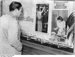1945 erhielten Fleming, Chain und Florey für ihre Entdeckung, die einen Wendepunkt in der Geschichte der Medizin markiert, gemeinsam den Nobelpreis.[23] Der Wirkstoff beendete das seit der Antike bestehende medizinische Problem, dass chirurgische Verletzungen aufgrund einfacher Wundinfektionen auch lange nach den Kriegshandlungen zum Tod der Betroffenen führen können, und wurde deshalb auch nach dem Krieg noch in der Bevölkerung als Wundermedizin angesehen. In Deutschland konzentrierte man sich auf die Weiterentwicklung der auch heute noch eingeschränkt gebräuchlichen Sulfonamide, da der Alliierte Kontrollrat die Nutzung von Penicillin weder in der Forschung noch in der medizinischen Anwendung erlaubt hatte. Erst 1946 gelangte ein Penicillinstamm unter letztlich ungeklärten Umständen zur Stolberger Firma Chemie Grünenthal, wo eine Produktion begonnen wurde. Allgemein erhältlich[24] wurde das zuvor importierte Penicillin in Deutschland erst nach 1949. Auch die Biochemie GmbH in Kundl/Tirol (Österreich) (heute Sandoz[25]) war an der Erforschung und Verbreitung von Penicillin beteiligt. Im Jahr 1953 entdeckten dort die Chemiker Ernst Brandl und Hans Margreiter und der Pharmakologe Marco Giovannini das säurestabile Penicillin V (Phenoxymethylpenicillin) für die orale Therapie.[26][27][28]