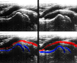 Die Aussagekraft der Sonografie kann erheblich durch die Anwendung des Doppler-Effekts erhöht werden. Man unterscheidet eindimensionale Verfahren (Pulsed-Wave-Doppler, Continuous-Wave-Doppler, auch als D-mode bezeichnet) von zweidimensionalen, farbkodierten Anwendungen (Farbdoppler – F-mode). Die Kombination B-Bild mit Pulsed-Wave-Doppler (PW-Doppler) nennt man auch Duplex.[4]