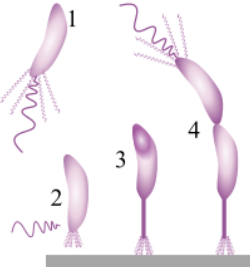 Typische Mikroorganismen haben nach landläufiger Vorstellung Geißeln (Abb. 6, 1) und bewegen sich frei in der Wassersäule. Tatsächlich handelt es sich bei solchen Schwärmerzellen[FSE 3] in der Regel nur um das Verbreitungsstadium von Biofilm-Bewohnern.