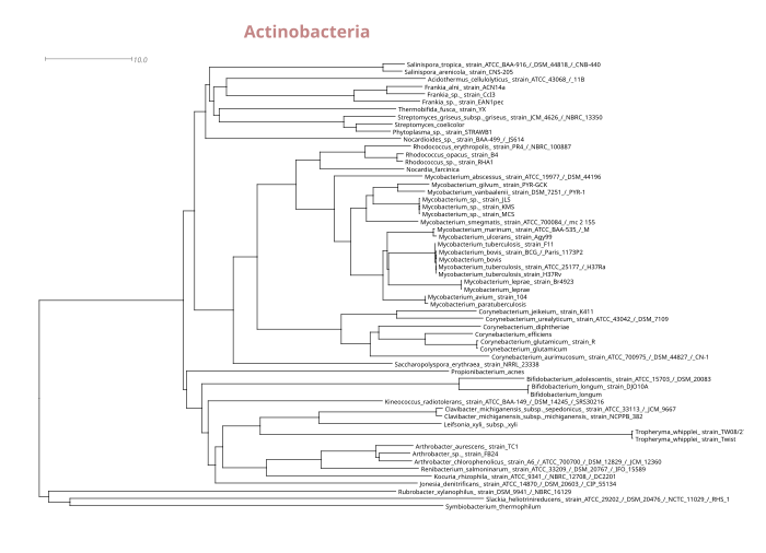 Die bereits genomsequenzierten Mitglieder der Actinobacteria lassen sich durch Untersuchung orthologer Gene in ein Abstammungsverhältnis bringen. Der abgebildete phylogenetische Baum zeigt die Verwandtschaftsverhältnisse der Actinobacteria (Stand 2010).[14]