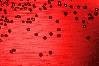 Kolonien von Haemophilus influenzae (Ordnung Pasteurellales) in einem Blutagar