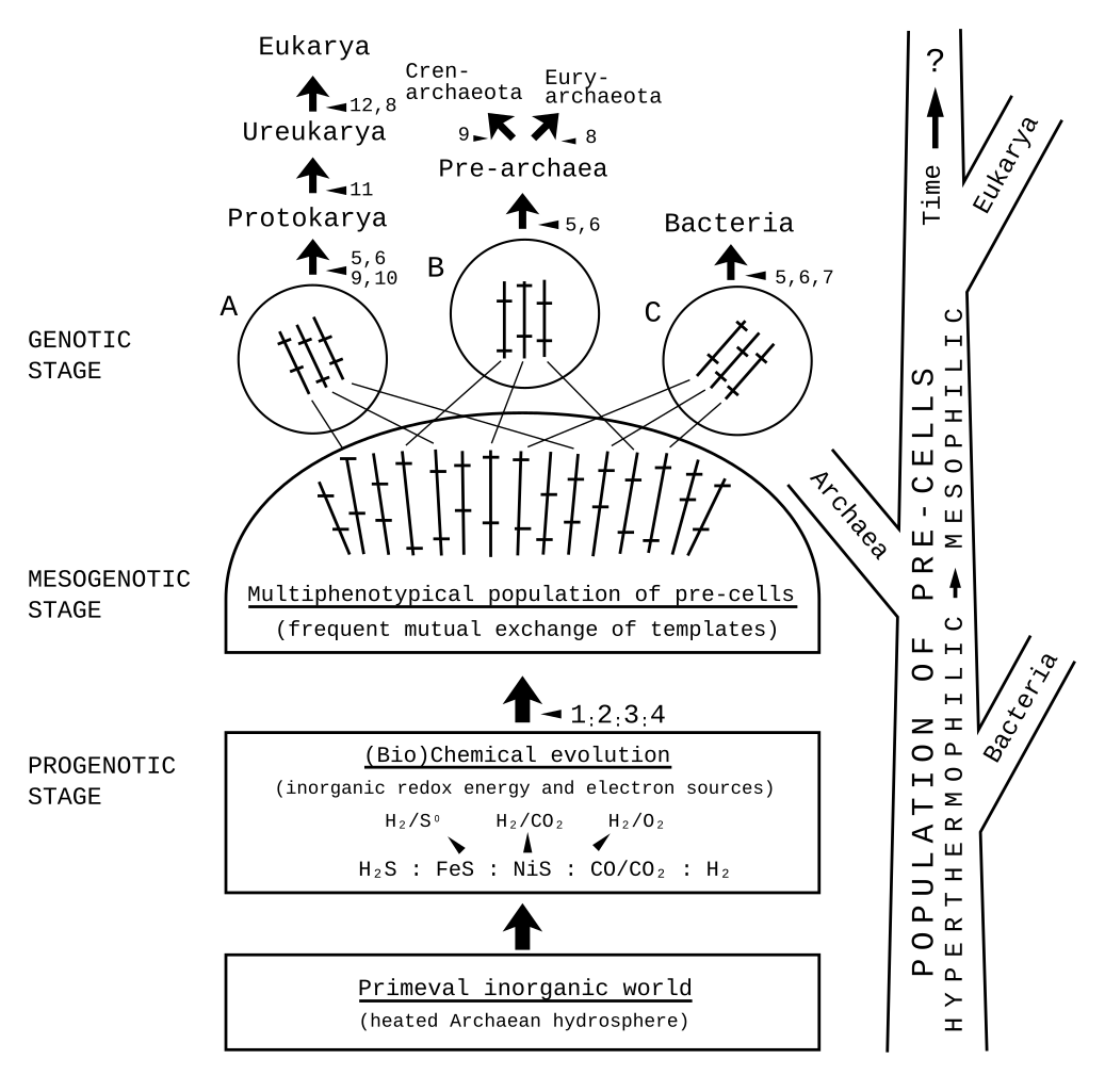 Wichtige evolutionäre Verbesserungen werden durch Zahlen gekennzeichnet: (1) Reduktive Bildung organischer Verbindungen aus CO oder CO₂ durch Me-Schwefel-Koordinationschemie; (2) Nutzung verschiedener Redox-Energiequellen und Bildung primitiver Enzyme und Matrizen; (3) Elemente eines Transkriptions- und Translationsapparats und lose Assoziationen; (4) Bildung von Präzellen; (5) stabilisierte zirkuläre oder lineare Genome; (6) Zytoplasmamembranen; (7) starre Murein-Zellwände; (8) verschiedene starre Nicht-Murein-Zellwände; (9) glykoproteinhaltige Zellhülle oder Glykokalyx; (10) Zytoskelett; (11) komplexe Chromosomen und Kernmembran; (12) Zellorganellen durch Endosymbiose (Kandler 1998, S. 22, Abb. 2.3).