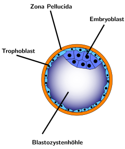 Durch diese Polarisation der Zellen wird durch die äußeren Zellen ein aktiver Flüssigkeitsstrom ins Innere der Morula ausgelöst. Infolgedessen bildet sich die Blastozyste, das Volumen in ihrem Inneren steigt an und sie tritt aus der Zona pellucida (Eihülle) aus. Unterstützt wird dieser Vorgang durch eine enzymatische Zersetzung der Zona pellucida. Die inneren Zellen der Morula – der Embryoblast bzw. die innere Zellmasse (IZM) – bleiben dabei nur an einer Seite erhalten (embryonaler Pol), während sich aus den umhüllenden Zellen der Trophoblast bildet – eine schützende Hülle, aus der schließlich Plazenta und Eihäute entstehen werden. Im Stadium der Blastozyste erfolgt bei Säugetieren einschließlich des Menschen die Einnistung (Nidation).