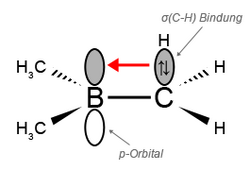 Als Beispiel kann die Verbindung B(CH3)3 dienen: Die Elektronen werden hier aus der σ(C-H) Bindung in das leere p-Orbital am Bor verschoben (siehe Schaubild rechts).