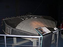 In einem hadronischen Kalorimeter lassen sich Teilchen nachweisen, die überwiegend der starken Wechselwirkung unterliegen.[A 1] Da hadronische Teilchen szintillierendes Material fast ungehindert durchdringen, ist ein Aufbau wie beim elektromagnetischen Kalorimeter nicht möglich. Häufig werden daher hadronische Kalorimeter als „Sampling“-Kalorimeter in Schichten ausgeführt, wobei sich empfindliche Nachweisschichten mit unempfindlichen, nur dem Energieverlust dienenden Schichten abwechseln. In diesen Absorbern finden die Wechselwirkungsprozesse der hadronischen Teilchen statt, die dann Elektronen, Photonen, Kernfragmente und Hadronen erzeugen; diese werden wiederum in der anschließenden sensitiven Schicht durch Erzeugung von Szintillationslicht nachgewiesen.[3]