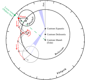 Befindet sich im Mittelpunkt des Deferenten die Erde, dann würde sich von ihr aus gesehen der Planet zunächst mit der Bewegung auf dem Deferenten gegen den Uhrzeigersinn bewegen, was der durchschnittlichen Bewegung des Planeten durch den Sternenhimmel entspricht. Während der Hälfte der Zeit summiert sich zu dieser Bewegung die ebenfalls gegen den Uhrzeigersinn gerichtete Bewegung auf dem Epizykel. In der übrigen Zeit aber läuft der Planet auf dem Epizykel entgegengesetzt zur Bewegung auf dem Deferenten, wodurch sich seine Gesamtbewegung am Himmel verlangsamt und schließlich für kurze Zeit rückläufig wird, sodass die Planetenbahn schließlich eine Schleife vollführt.