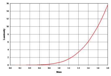 Die Leuchtkraft (L) eines Sterns hängt näherungsweise mit der Gesamtmasse (M) zusammen wie in der folgenden Gleichung: