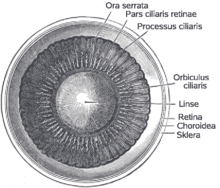Den weitaus größten Teil der Innenfläche des Augapfels bildet die Pars optica retinae genannte Neuroretina, welche die Fotorezeptoren trägt. Nach vorne zu ist sie etwa 3 mm hinter dem Ziliarkörper (Corpus ciliare) mit einer zackenförmigen Grenze, der Ora serrata, von der Pars caeca retinae (lat. caecus ‚blind‘) abgesetzt, die ganz vorn als Pars ciliaris retinae den Ziliarkörper überzieht. Die vorderen Netzhautabschnitte können am intakten Auge bei der Kontaktglasuntersuchung mit einem Dreispiegelkontaktglas betrachtet werden.