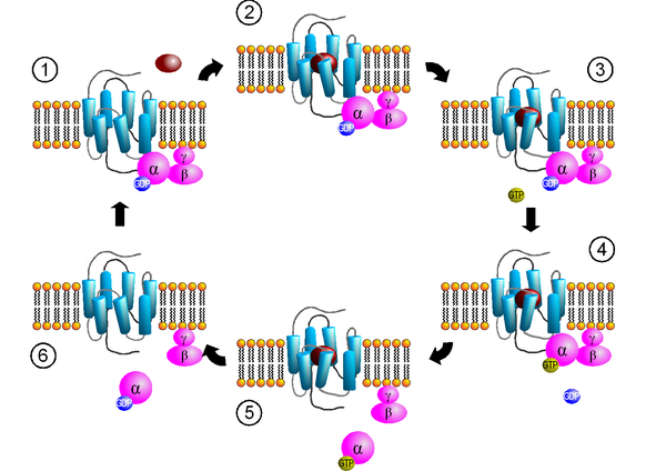 (1) Bindung des G-Proteins; (2) Ligandenbindung; (3) Aktivierung des Rezeptors; (4) Aktivierung des G-Proteins; (5) Dissoziation des G-Proteins und Signaltransduktion; (6) Inaktivierung des G-Proteins