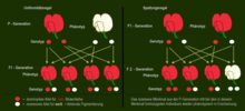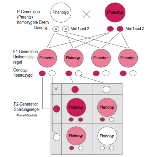 Der erste Vererbungsschritt von der P-Generation zur F1-Generation wird hier in einem anderen Erbschema dargestellt als die darauf folgende Vererbung von der F1- zur F2-Generation. Das untere ist ein Punnett-Quadrat