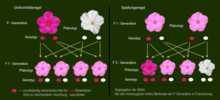 F2-Generation. Rote, rosa und weiße Blütenfarben treten mit einem 1:2:1 Verhältnis auf.