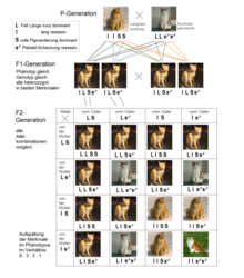 Beispiel im nebenstehenden Erbschema: P-Generation: Jedes Elterntier besitzt je ein dominantes und ein rezessives Merkmal jeweils reinerbig (homozygot). F1: Nach der Uniformitätsregel sind alle Individuen in Genotyp und Phänotyp gleich und mischerbig (heterozygot). Sie prägen die dominanten Merkmale im Phänotyp aus. F2: Nun sind alle Allelkombinationen möglich. Die Merkmale werden unabhängig voneinander vererbt, so dass neue Kombinationen auftreten können. Durchschnittliches Zahlenverhältnis der Phänotypen 9:3:3:1. Bei diesem Beispiel in der F2-Generation: 9 voll pigmentierte mit kurzem, 3 voll pigmentierte Katzen mit langem Fell und 3 weiß gescheckte mit kurzem Fell, sowie eine weiß gescheckte Katze mit langem Fell entstanden durch Neukombination der beiden rezessiven Merkmale. Die Spaltungsregel und die Unabhängigkeitsregel stehen in Einklang mit der Chromosomentheorie der Vererbung.
