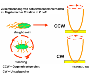 - Bei sich im Uhrzeigersinn drehenden Flagellen wird kein Bündel gebildet und jedes Flagellum zeigt in eine andere Richtung. In der Folge taumelt das Bakterium auf der Stelle.