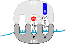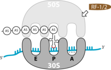Ribosomen bestehen aus zwei Untereinheiten, die jeweils wiederum aus RNA (ribosomale RNA) und Polypeptiden (ribosomale Proteine) aufgebaut sind. Zunächst sind die beiden Untereinheiten getrennt. Bei der Translation vereinigen sie sich und bilden zwei Bereiche aus, an denen die tRNAs anlagern können: die Aminoacyl-Stelle (A-Stelle) für die tRNA mit der nächsten anzufügenden Aminosäure, die Peptidyl-Stelle (P-Stelle) für die tRNA der an die wachsende Peptidkette angefügten Aminosäure. Die entladenen tRNA-Moleküle verlassen das Ribosom dann über eine andere Region, die Exit-Stelle (E-Stelle).