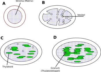D: Durch Ausbau der Membransysteme, wobei die Grana-Thylakoidstapel durch (ungestapelte) Stroma-Thylakoide miteinander verbunden werden, entsteht der Chloroplast