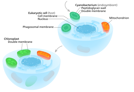 Ein Eukaryot mit Mitochondrien umschloss einst ein Cyanobakterium. Aus diesem entwickelten sich im Lauf der Evolution dann Chloroplasten, so dass dieses Ereignis den Ausgangspunkt einer Abstammungslinie von Zellen mit beiden Organellen bildete. Man beachte, dass das zum Endosymbiont werdende Cyanobakterium bereits zuvor eine Doppelmembran hatte – die Membran der phagosomalen Vakuole (Nahrungsvakuole) ging in diesem Fall verloren.