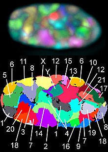 Chromosomen nehmen während der Interphase abgegrenzte Bereiche im Zellkern ein, die Chromosomenterritorien. Deren Existenz wurde zuerst von Carl Rabl (1885) und Theodor Boveri (1909) vorgeschlagen, der direkte Nachweis gelang erst 1985 mit Hilfe der Fluoreszenz-in-situ-Hybridisierung.