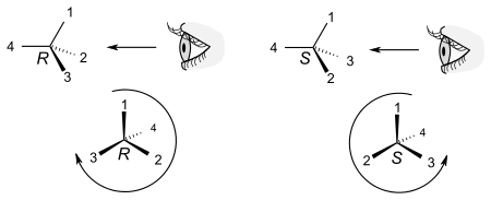 Der Substituent mit der niedrigsten Priorität 4 wird hinter die Bildebene gestellt. Anschließend zählt man kreisförmig um das aktive Zentrum vom Substituenten mit der Priorität 1 bis zur Priorität 3. Läuft diese Kreisbewegung rechtsherum, also im Uhrzeigersinn, so liegt eine (R)-Konfiguration vor, läuft sie linksherum (gegen den Uhrzeigersinn), so liegt eine (S)-Konfiguration vor. (R) ist die Abkürzung von lateinisch rectus (gerade) und (S) von lateinisch sinister (links).