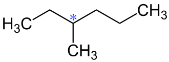![]() Zweidimensionale Präsentation von 3-Methylhexan mit einem Stereozentrum an einem Kohlenstoffatom (mit einem blau markierten Sternchen (✱) gekennzeichnet). |