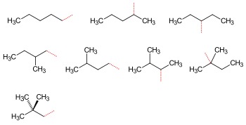 Obere Reihe von links nach rechts: n-Pentyl (Amyl), 2-Pentyl (sec-Pentyl), 3-Pentyl;