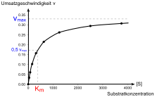 - Die Enzymaktivität nähert sich mit steigender Substratkonzentration hyperbolisch einem Maximum an. Diejenige Substratkonzentration, bei der die halbmaximale Reaktionsgeschwindigkeit erreicht wird, heißt Michaeliskonstante (Km-Wert). Der Zustand halbmaximaler Reaktionsgeschwindigkeit wird dabei als derjenige Zustand gedeutet, in dem die Hälfte der Enzymmoleküle Substrat gebunden haben, sodass der Km-Wert ein Maß für die Affinität des Enzyms zum Substrat darstellt.