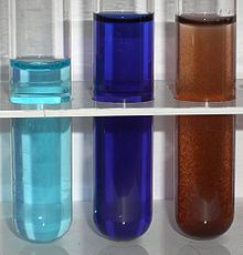 Wasserfreies, weißes Kupfersulfat färbt sich bei Zugabe von Wasser hellblau – eine Nachweisreaktion für Wasser. Es entsteht ein Aqua-Komplex des Kupfers, bei dem sechs Wassermoleküle als Liganden des Zentralions auftreten, wobei die beiden axial gelegenen Liganden deutlich weiter vom Zentralion entfernt sind (Jahn-Teller-Effekt):