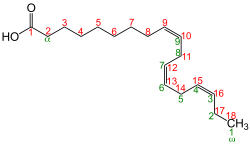 Relative Abstände von funktionellen Gruppen wurden früher gelegentlich durch griechische Kleinbuchstaben gekennzeichnet. Heute gilt diese Nomenklaturvariante als halbsystematisch, ist aber vor allem im Bereich der ungesättigten Fettsäuren noch verbreitet. Dem der funktionellen Gruppe direkt benachbarten Atom wird dabei ein „α“ zugewiesen, dem folgenden „β“ usw. bis zum entferntesten, das unabhängig vom absoluten Abstand immer mit „ω“ beschrieben wird.