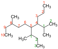 Der am häufigsten gebrauchte Lokantentyp in der chemischen Nomenklatur sind arabische Zahlen. So ist beispielsweise jedem Kohlenstoffatom in einem organischen Molekül eine Nummer zugewiesen, wobei bei gesättigten aliphatischen Kohlenwasserstoffen die längste Kohlenstoffkette das Stammsystem kennzeichnet; alle kürzeren Verzweigungen gelten als Seitenketten. Die Stammkette wird so nummeriert, dass die Lokanten der Verzweigungsstellen möglichst klein sind. Die Seitenketten werden ebenfalls durchnummeriert, wobei hier immer das Verknüpfungsatom mit der Stammkette die Nummer 1 erhält. In Alkylresten erhält also die „yl“-Stelle (Kohlenstoffatom mit der freien Valenz) bei der Bezifferung der Kette den Lokanten 1.