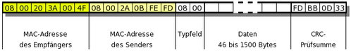 In jedem Frame nach Ethernet-II-Variante wird vor dem Typfeld und den Daten zunächst die MAC-Adresse des Empfängers und des Senders übertragen. Empfänger und Sender müssen Teil des Local Area Networks (LAN) sein. Soll ein Paket in ein anderes Netz geschickt werden, wird es auf Ethernet-Ebene zunächst an einen Router geschickt. Dieser analysiert die Daten auf der untergeordneten Schicht und vermittelt das Paket dann weiter. Er erzeugt dazu einen neuen Ethernet-Frame, wenn es sich bei dem Nachbarnetz ebenfalls um ein Ethernet handelt. Dazu ersetzt ein Router die MAC-Adressen, d.h. wenn Router R1 ein Ethernet-Frame empfängt und es an den Router R2 weitergeben soll, ersetzt R1 die Quelladresse mit seiner eigenen MAC-Adresse und die Zieladresse mit der Mac-Adresse von R2.