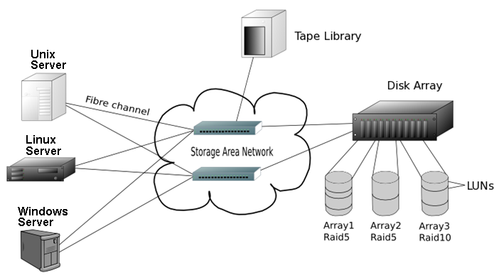 SANs werden heute meistens über Glasfaserkabel gebildet; das dabei eingesetzte System wird als Fibre Channel bezeichnet. Ein einfaches SAN besteht aus einem Fibre-Channel-Switch, einem oder mehreren Festplattensubsystemen und den Servern, die über sogenannte Host-Bus-Adapter, kurz HBA, mit dem Fibre-Channel-Switch verbunden werden.