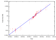 Die zeitliche Entwicklung der maximalen Festplattenkapazität zeigt einen annähernd exponentiellen Verlauf, vergleichbar mit der Entwicklung der Rechenleistung nach dem Mooreschen Gesetz. Die Kapazität hat sich bei leicht sinkenden Preisen etwa alle 16 Monate verdoppelt, wobei sich der Kapazitätszuwachs seit etwa 2005 verringerte (Januar 2007: 1 Terabyte, September 2011: 4 Terabyte).