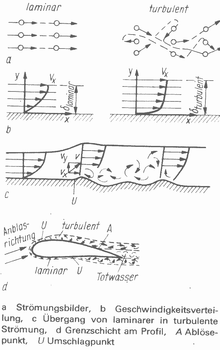 - Der Widerstand ist bei turbulenter Strömung größer als bei laminarer; dementsprechend ist die Gleitzahl schlechter. Das Wirbelgebiet hinter dem Abreißpunkt vergrößert den Widerstand nochmals.