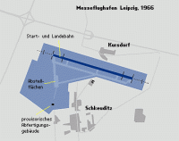 ab 1949 Aufnahme des zivile Flugbetriebes zunächst unter Kontrolle der SMAD; 1950 Übergabe an die DDR; Ab 1957 ist der Platz in das Inlands-Liniennetz eingebunden. Interflug-Flugplatz bis 1962 Messe-Flugplatz. Am 06.03. 1972 letzter Start zu einem Linienflug Verlegung nach Schkeuditz. 1958 technische Basis für Agrarflug und Ausbildungseinrichtung. Gleichzeitig entsteht im Südteil ein GST-Flugplatz. |