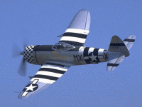 Jagdflugzeug; Die Thunderbold war eines der erfolgreichsten us-amerikanischen Kampfflugzeug des Zweiten Weltkrieges. Mit ihrer maximalen Startmasse von über 9.000 kg eines der schwersten einsitzigen Flugzeugen im Zweiten Weltkrieg. Die Entwicklung begann 1940, XP-47. Als Ausgangsmuster können die YP-43 Lancer sowie die P-44 gelten. Als dann ein leistungsstärkerer Motor (1.470 kW) zur Verfügung stand, wurde mit der P-47B die erste Serienversion gebaut. Insgesamt sind 15.683 Maschinen aller Versionen davon gingen im Rahmen des Pacht-und Leihvertrages 88 Maschinen an Brasilien; 860 nach Großbritannen und 196 in die UdSSR. Vier Gruppen der frei-französischen Streitkräfte wurden ab 1943 mit diesem Muster ausgerüstet. In den Nachkriegsjahren wurden mehrere Luftwaffen in Südamerika mit diesem Typ ausgerüstet. Im Jahre 2005 gab es weltweit noch 8 flugfähige Exemplare. |