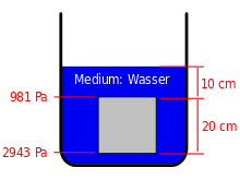 Im Beispiel (Bild 1) gehen wir von einem Würfel mit 20 cm Kantenlänge aus. Er ist 10 cm tief unter die Wasseroberfläche eingetaucht. 1\,\mathrm {Pa} =1~{\frac {\mathrm {N} }{{\mathrm {m} }^{2}}}