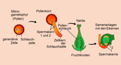 Eine Angiospermen-Blüte besteht aus folgenden Bestandteilen (die jedoch nicht alle vertreten sein müssen): die Blütenachse (Blütenboden), aus der die Blütenorgane entspringen: eine Blütenhülle (Perianth) als Perigon oder getrennt in eine Kelch- und Kronblatthülle, das Androeceum aus Staubblättern und das Gynoeceum aus Fruchtblättern. Die Staubblätter bilden den Pollen, der bei der Bestäubung auf die Narbe der Fruchtblätter gelangt, dort auskeimt und die im Fruchtblatt gelegenen Samenanlagen befruchtet, genauer die in der Samenanlage befindliche Eizelle (Befruchtung). Die befruchtete Eizelle entwickelt sich zum pflanzlichen Embryo, die Samenanlage entwickelt sich zum Samen und die gesamten verbleibenden Teile der Blüte werden zur Frucht.