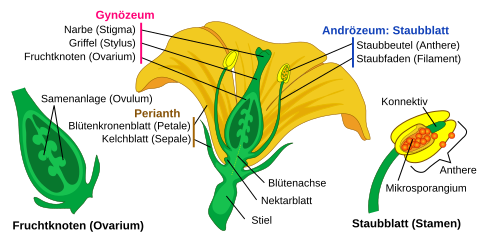 - ↑ “a flower as a determinate, compressed, bisexual reproductive axis composed of megasporangia (carpels), microsporangia (stamens) and a sterile perianth composed of at least one sterile laminar organ”. G. Theißen, R. Melzer: Molecular Mechanisms Underlying Origin and Diversification of the Angiosperm Flower. In: Annals of Botany. Band 100, 2007, S. 603–619.