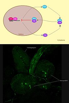 Zudem ist das Gen fruitless (fru) an dem sexuellen Dimorphismus des zentralen Nervensystems beteiligt. Im weiblichen Wildtyp stellt es das nonfunktionale Protein FruF her. Im Männchen entsteht dementsprechend das Protein FruM. Dieses ist entscheidend für das normale Balzverhalten der Männchen. In Versuchen, bei denen man weibliche Mutanten herstellte, welche das Protein FruM synthetisieren konnten, konnte festgestellt werden, dass die Regionen, die normalerweise bei Männchen vergrößert sind, auch in diesen Weibchen vorhanden waren, wenn auch nicht im gleichen Ausmaße.[25][26]