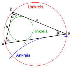 Die Winkelhalbierenden der drei Innenwinkel schneiden sich ebenfalls in einem gemeinsamen Punkt, nämlich im Mittelpunkt des Inkreises. Dieser berührt die drei Seiten von innen. Die drei Kreise, die jeweils eine Seite von außen und die Verlängerungen der beiden anderen Seiten berühren, heißen Ankreise des Dreiecks.