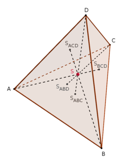 In einem Tetraeder bezeichnet man eine Strecke, die einen Eckpunkt mit dem Schwerpunkt der dem Eckpunkt gegenüberliegenden Dreiecksfläche verbindet, als Median des Tetraeders. Die vier Mediane einen Tetraeders schneiden sich in einem Punkt, dem Schwerpunkt des Tetraeders. Dieser teilt die Mediane in einem Verhältnis von 3:1 (Satz von Commandino).