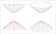 Beide Flächen lassen sich durch eine quadratische Gleichung – analog zu den Gleichungen von Ellipse und Hyperbel – beschreiben. Sie sind deshalb Spezialfälle von Quadriken (z. B. Kugel, Kegel, Paraboloid) und werden typischerweise von Ebenen in Kegelschnitten geschnitten.