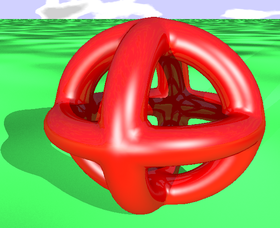 Bei den letzten beiden Bildern wurden die triangulierten Flächen mit dem Programm PovRay nachbearbeitet. Beim Vergleich der Bilder mit den 3 Tori beachte man, dass das PovRay-Bild eine Zentralprojektion ist.