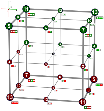 Die folgende Tabelle zeigt die Vorzeichen-Tupel zusammen mit möglichen Nummerierungen. Eine binäre Nummerierung mit – als 1 lässt sich leicht für verschiedene Dimensionen verallgemeinern. Eine binäre Nummerierung mit + als 1 definiert die gleiche Reihenfolge wie eine balanciert ternäre. Die römische Nummerierung der Quadranten bringt die Vorzeichen-Paare in Gray-Code-Ordnung. Deshalb ist die entsprechende Reihenfolge auch in der Tabelle der Oktanten.