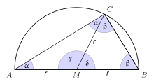 ABC sei ein Dreieck innerhalb eines Kreises mit [AB] als Kreisdurchmesser und dem Radius r. Dann ist der Mittelpunkt M der Strecke [AB] auch der Kreismittelpunkt. Die Streckenlängen [AM], [BM] und [CM] sind also gleich dem Radius r.