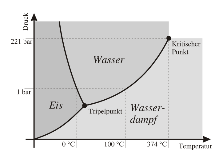 Wärmeeinwirkung verursacht eine schnellere Bewegung der Wassermoleküle. Werden an der Stelle der Wärmeeinwirkung 100°C erreicht, geht es dort vom flüssigen in den gasförmigen Aggregatzustand (Dampf) über, dessen Volumen um etwa das 1600-fache höher ist und der infolge seiner im Verhältnis zum umgebenden Wasser geringeren Dichte als mehr oder weniger große Blasen aufsteigt: Das Wasser beginnt zu sieden, wobei die Dampfblasen von noch nicht so heißem Wasser wieder abgekühlt werden und wieder zu flüssigem Wasser werden. Erreicht schließlich die gesamte Wassermenge die Temperatur von 100°C, so gelangen die nun großen Dampfblasen bis an die Oberfläche: Das Wasser kocht.