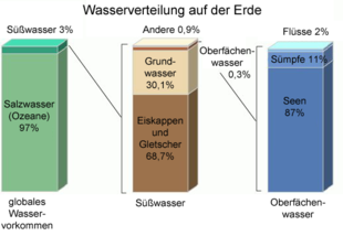 Der größte Teil der Erdoberfläche (71 %) ist von Wasser bedeckt, besonders die Südhalbkugel und als Extrem die Wasserhalbkugel. Die Wasservorkommen der Erde belaufen sich auf circa 1,4 Milliarden Kubikkilometer (entspricht dem Volumen eines Würfels mit 1120 km Kantenlänge), wovon der allergrößte Teil auf das Salzwasser Weltmeere entfällt. Nur 48 Millionen Kubikkilometer (3,5 %) des irdischen Wassers liegen als Süßwasser vor. Das mit 24,4 Millionen Kubikkilometern (1,77 %) meiste Süßwasser ist dabei als Eis an den Polen, Gletschern und im Dauerfrostböden gebunden und somit nicht der Nutzung zugänglich. Einen weiteren wichtigen Anteil macht das Grundwasser mit 23,4 Millionen Kubikkilometern aus. Das Wasser der Fließgewässer und Binnenseen (190.000 km³), der Atmosphäre (13.000 km³), des Bodens (16.500 km³) und der Lebewesen (1.100 km³) ist im Vergleich rein mengenmäßig recht unbedeutend. Dabei ist jedoch nur ein geringer Teil des Süßwassers auch als Trinkwasser verfügbar. Insgesamt liegen 98,233 ;% des Wassers in flüssiger, 1,766 % in fester und 0,001 % in gasförmiger Form vor. In seinen unterschiedlichen Formen weist das Wasser dabei spezifische Verweilzeiten auf und zirkuliert fortwährend im globalen Wasserkreislauf. Diese Anteile sind jedoch nur näherungsweise bestimmbar und wandelten sich auch stark im Laufe der Klimageschichte, wobei im Zuge der globalen Erwärmung von einem Anstieg des Wasserdampfanteils ausgegangen wird.