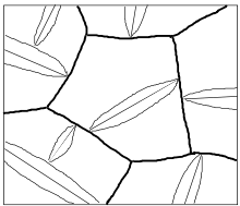 Die Platten werden einerseits durch die Korngrenzen des Austenits, und andererseits durch die schon bei höheren Temperaturen entstandenen Platten am Wachstum gehindert, so dass die neu entstehenden Platten mit der Zeit immer kürzer werden, und den Raum immer dichter benetzen. Die mittlere Länge der Platten bewegt sich dabei zwischen einem Viertel und einem Drittel der ursprünglichen Austenitkorngröße.